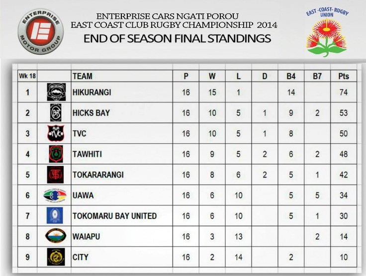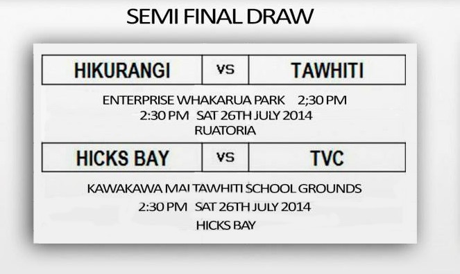 We have reached the end of the 2014 Club Season and 4 teams are left standing , Hikurangi , Hicks Bay , TVC and Tawhiti. Hikurangi have top the table for 2014 and will host Tawhiti at Whakarua Park @ 2.30pm on Saturday while Hicks Bay play TVC @ Kawakawa Mai Tawhiti School Grounds at 2.30pm also on Saturday 26th July.