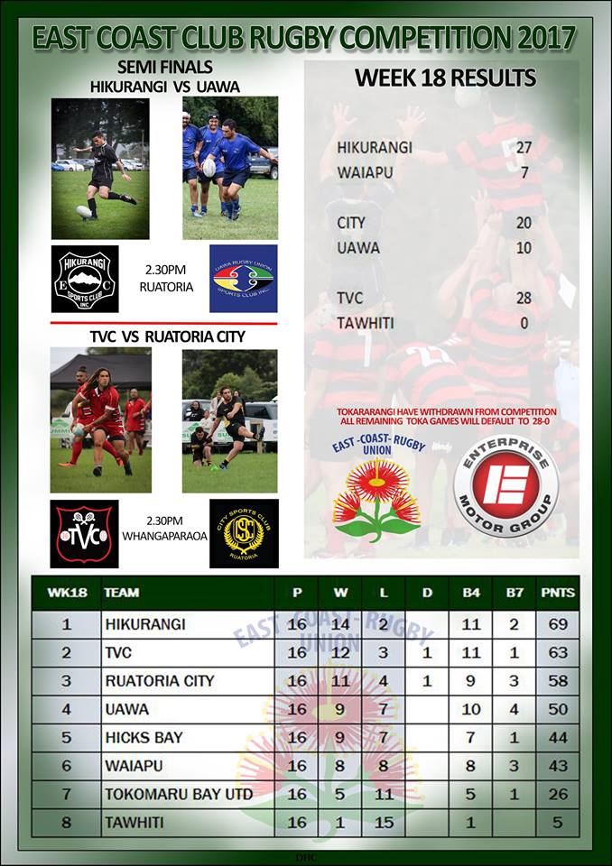 Hikurangi (top qualifiers) play Uawa (4) in Ruatoria in one semifinal this Saturday while TVC (2) host Ruatoria City (3) at Whangaparaoa in the other.
