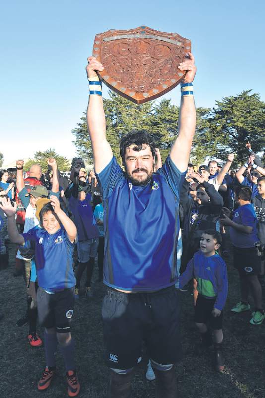 SHIELD STAYS PUT: Uawa skipper Scott Lasenby holds aloft the Rangiora Keelan Memorial Shield after his side defeated Tihirau Victory Club 24-23 in a thrilling East Coast club rugby final at Uawa Domain, Tolaga Bay, on Saturday. Picture by Paul Rickard