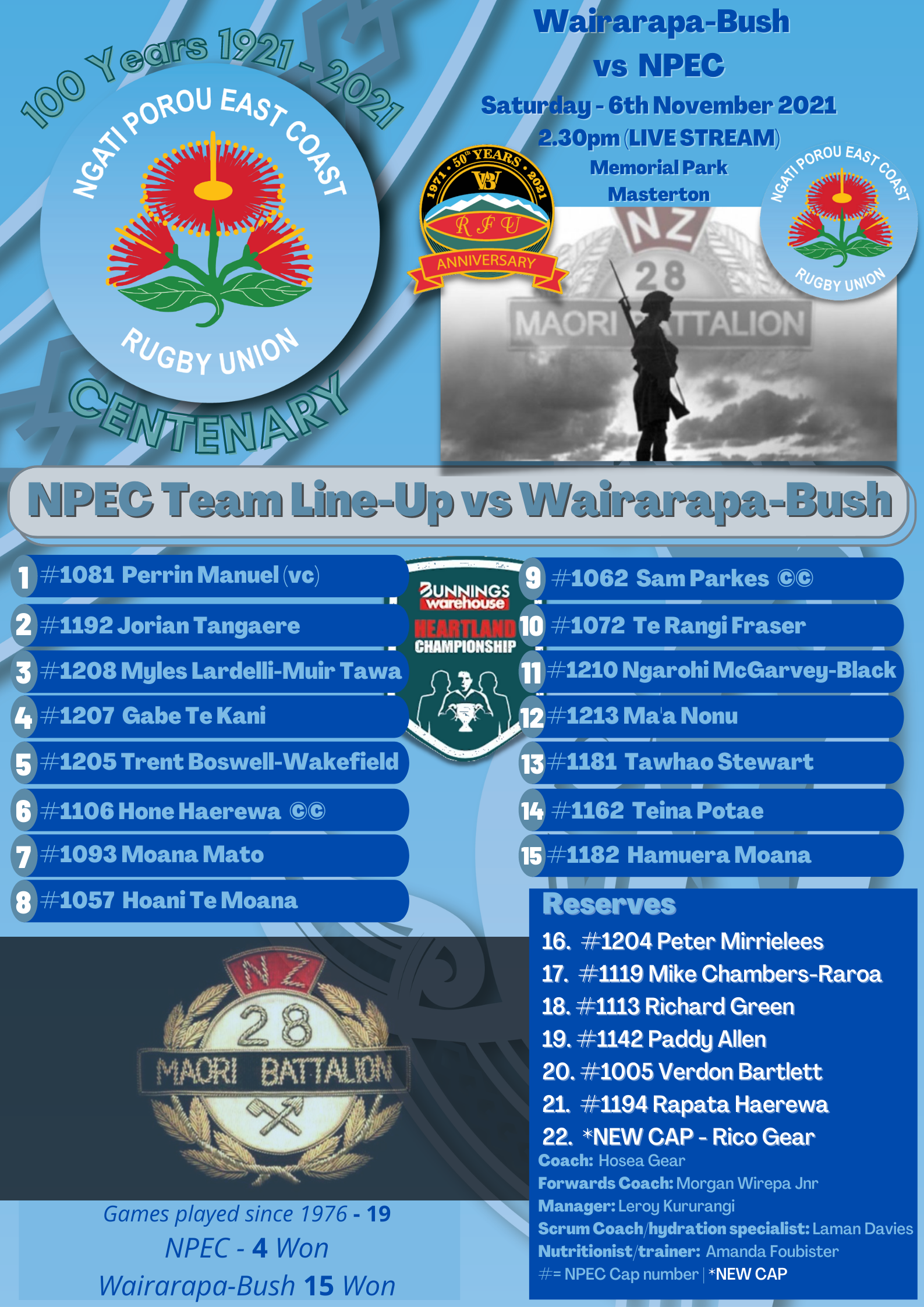 Team Announcement: NPEC v Wairarapa Bush (6th November 2021)